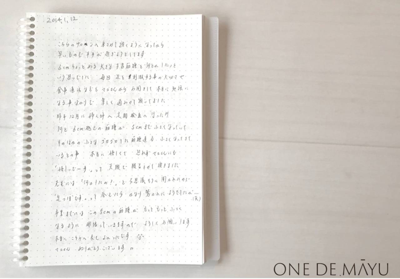 「切りがいのある筋腫やね」と医師に言われ、麻由さんのサロンに通い2年。筋腫が小さくなっているとのことで手術をしなくてもいいとなりました。