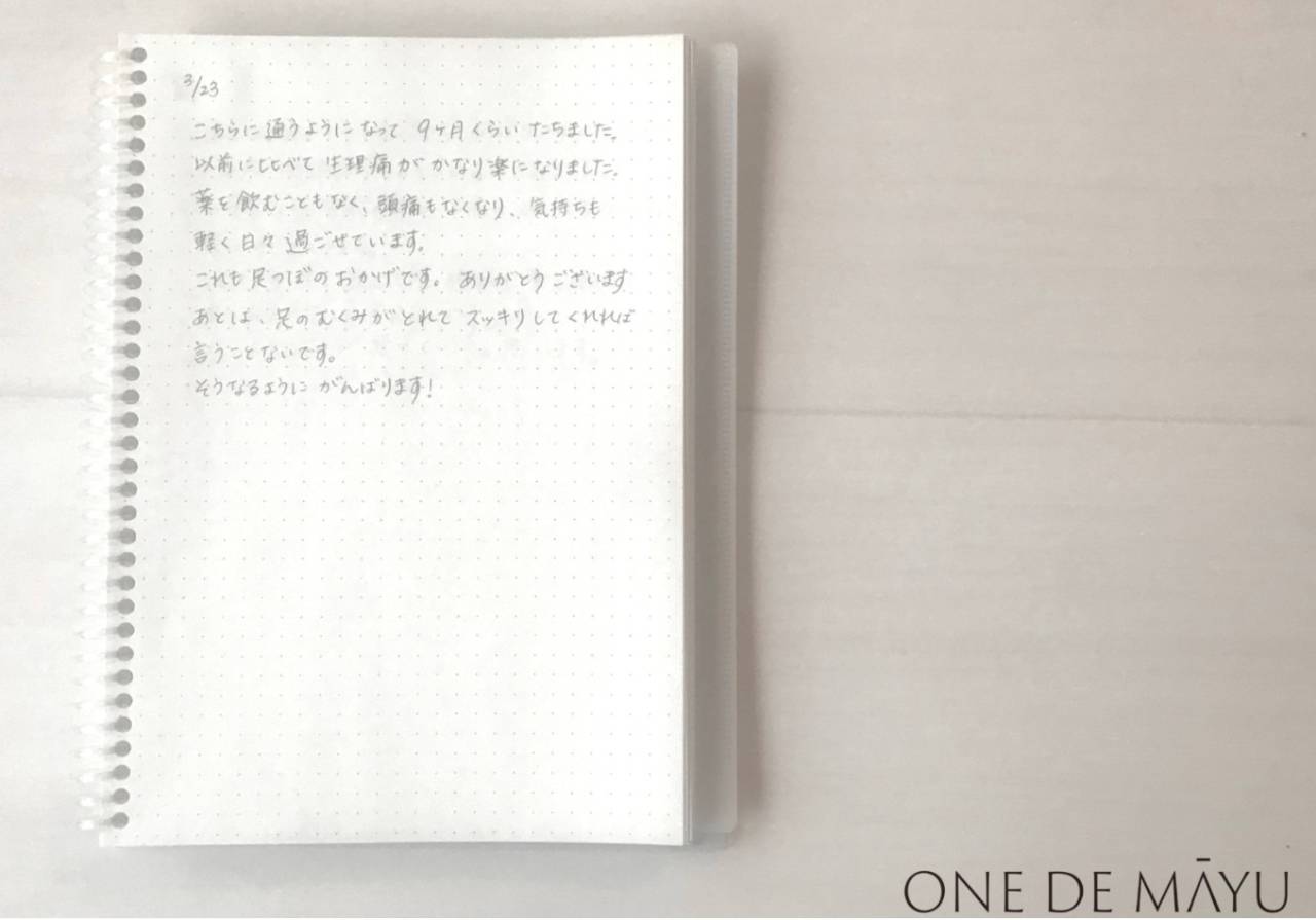 麻由さんの予約ができたときは涙するほどうれしかった。週末は寝込んでばかりだった私が、痛みもなくなって楽しく過ごせています。感謝しかありません。