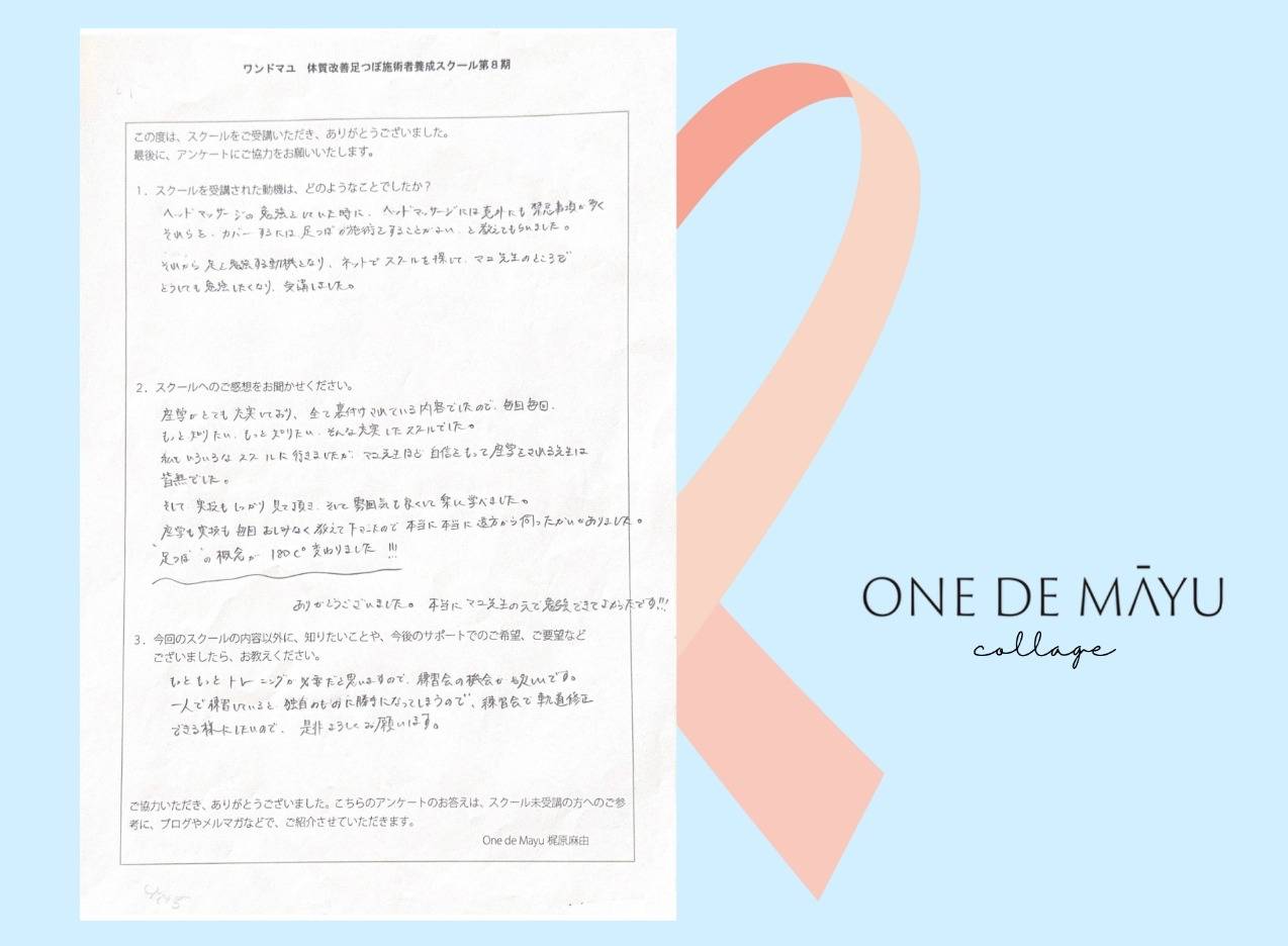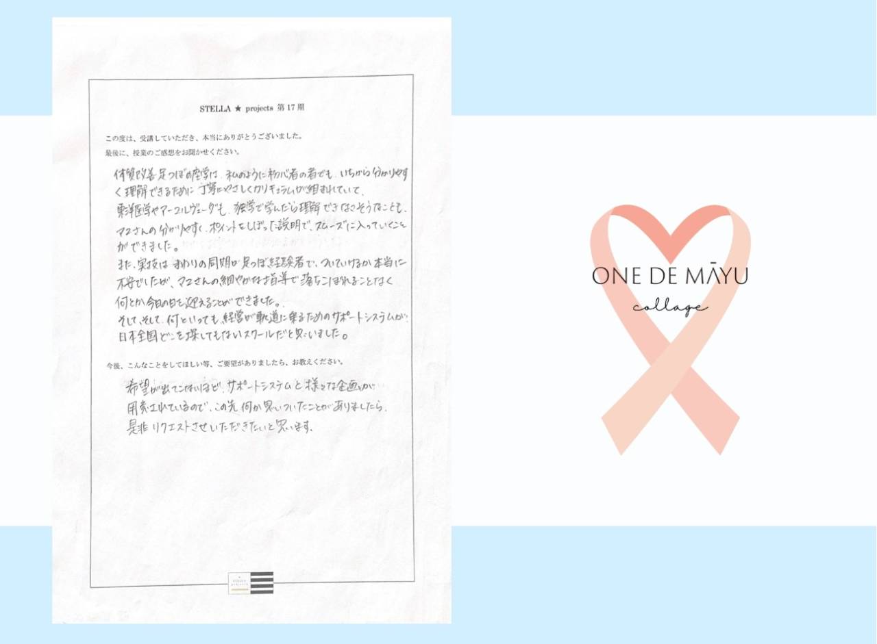 アロママッサージではお客様の悩みを根本的に解決してあげられず、どうしようと思ってた時、運良く先生のHPを見つけ、すぐに申し込みました。