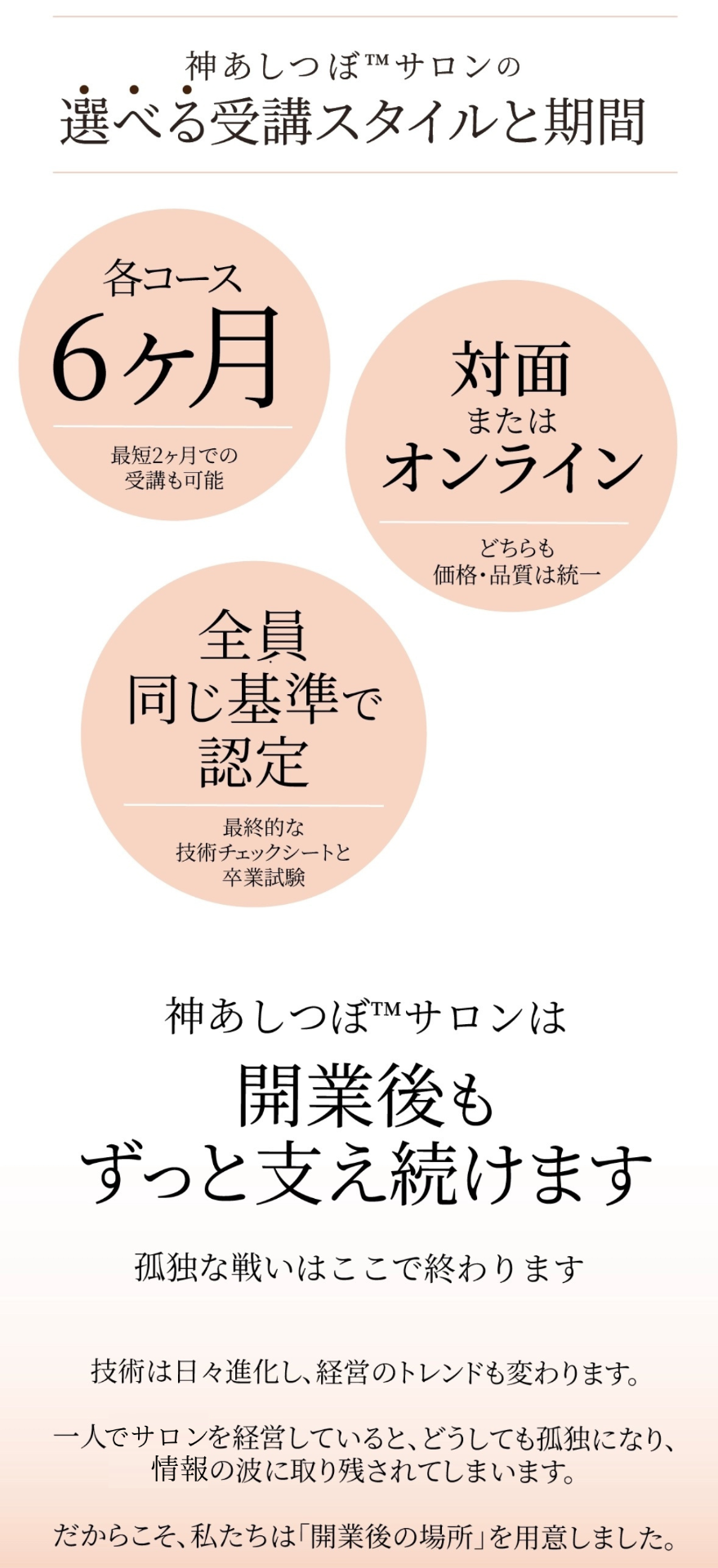はい、スペシャリストコースを修了すれば、「神あしつぼ™︎サロン」として開業できます。また、卒業後もアカデミー/ラボでサロン経営のサポートを受け続けられます。(その他コースの場合でもサロン開業は可能ですが、「神あしつぼ™︎サロン」としての開業はできません)