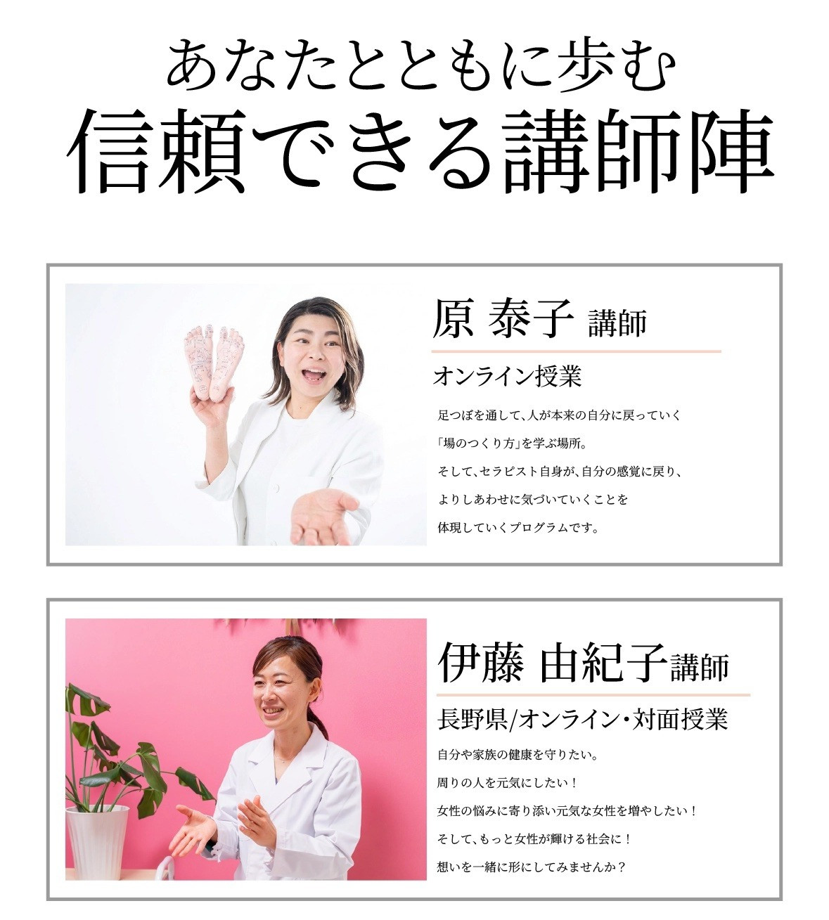とはいえ、当校でお教えしている神あしつぼ™︎「iTubo(あいつぼ)」は手への負担も少ないため、⻑く続けやすい技術でもあります。そして、婦人科体質改善コンサルタント®︎のお仕事では、オンラインだけでもできるので、施術がしんどくなってきたら仕事のやり方を変えることも可能です。