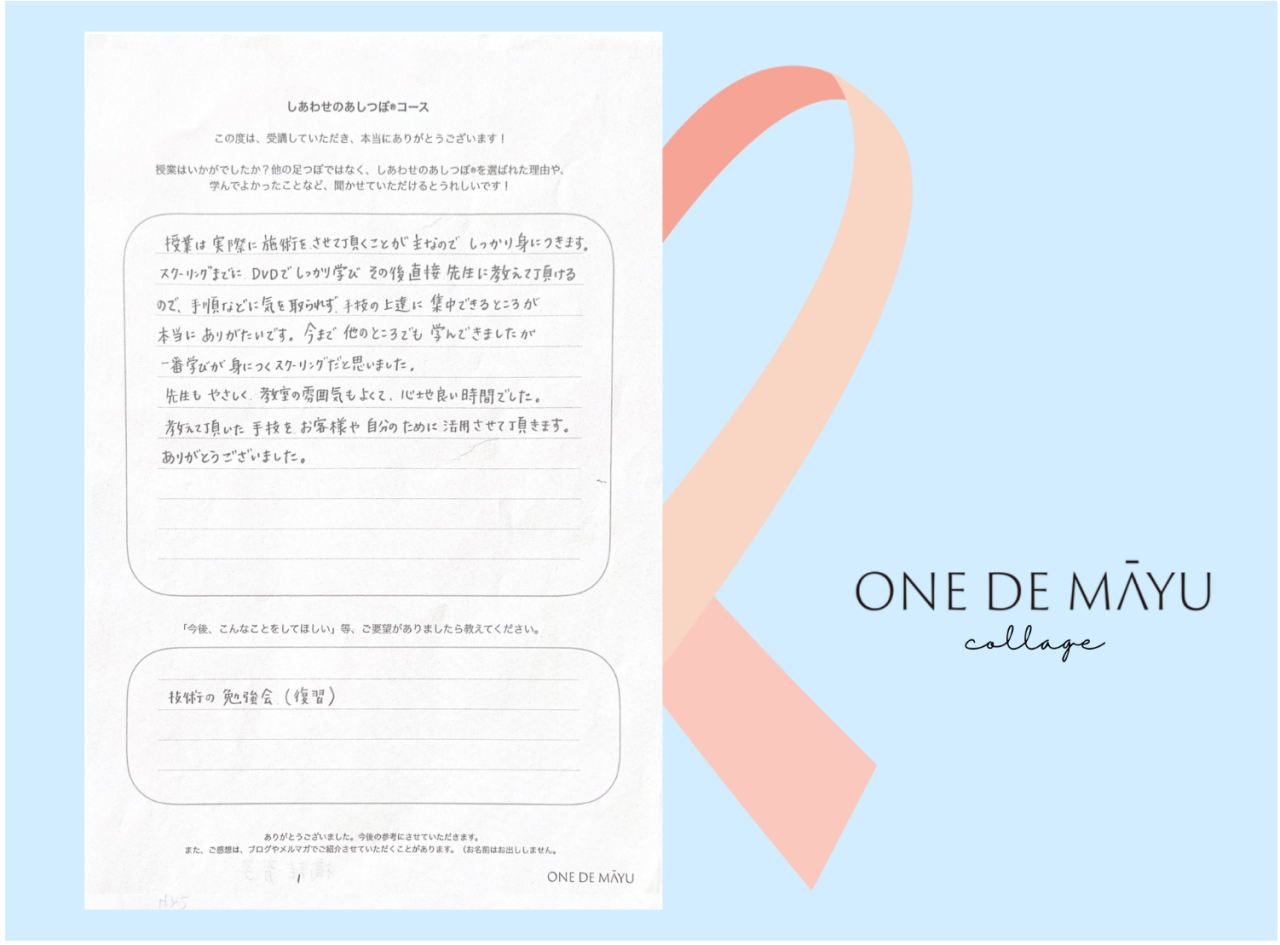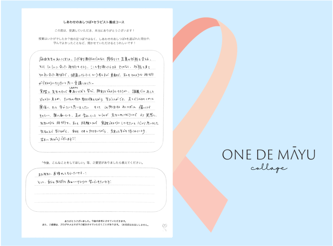 麻由先生のあしつぼは、ただ刺激するのではなく、彫刻して足裏の状態を変える、そして1人1人に合った施術を行う、ここを刺激したらOKではなく、状態を見てその方に合った施術で、健康になっていくという考え方が素敵で、私もそのような施術ができるようになりたいと思い受講しました。