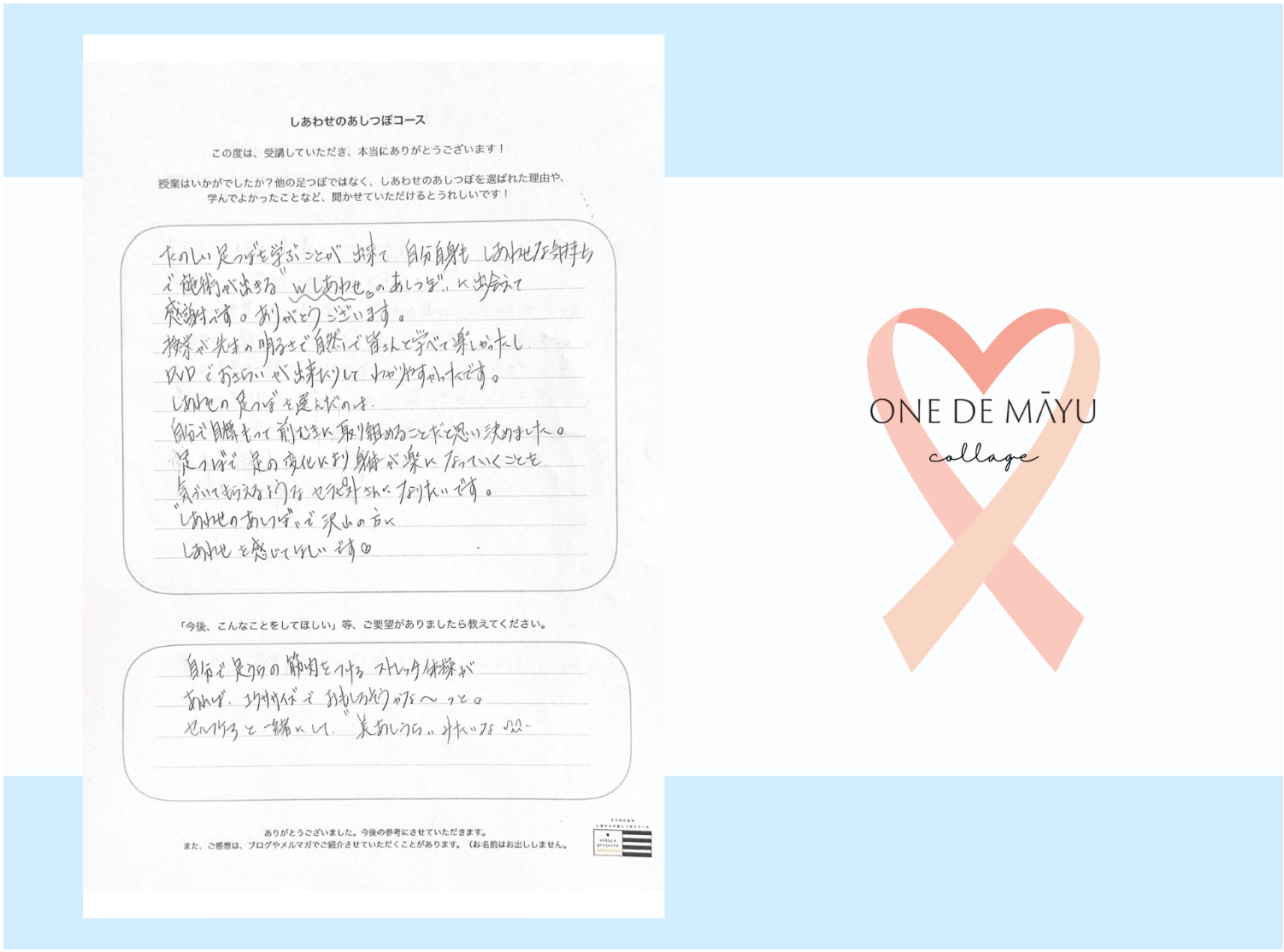 今まで教わったスクールは自分の技術を出し惜しみしてる所が見えたりで、こちらも自信が持てず終了してましたが、メールとのやりとりもあってスクール以外でも常に足つぼに関心を持てました。