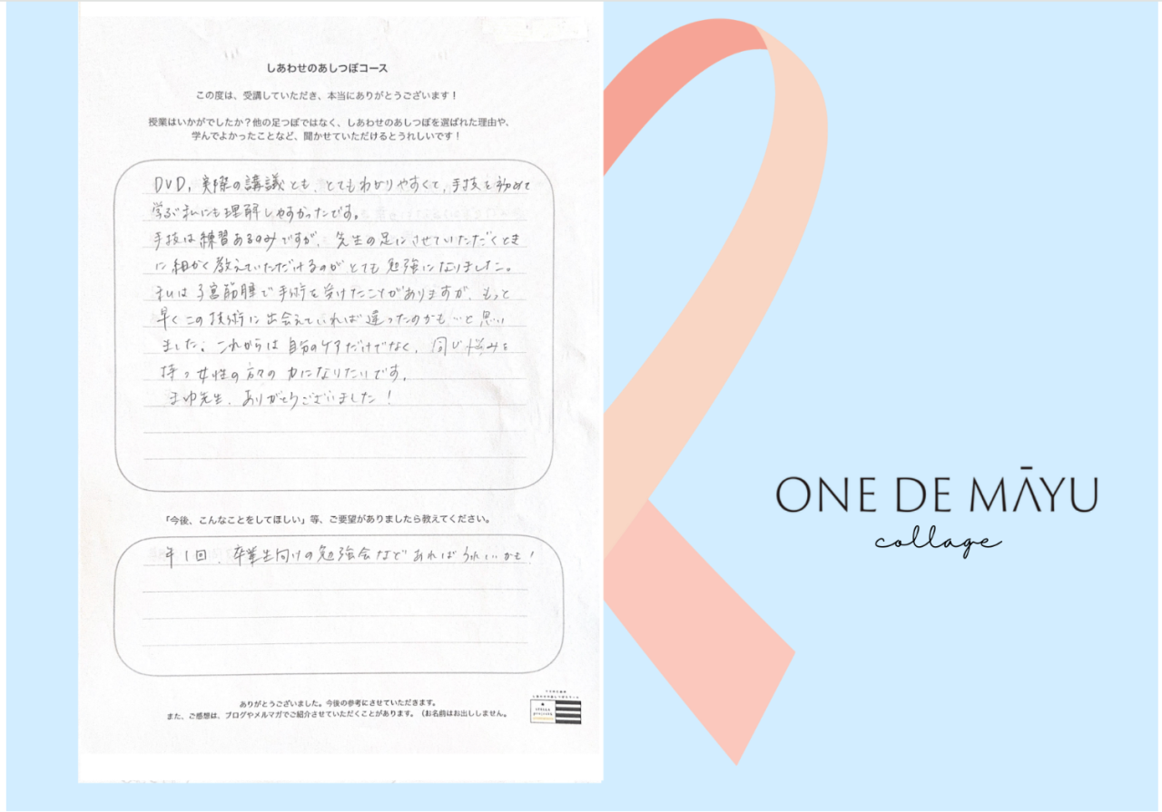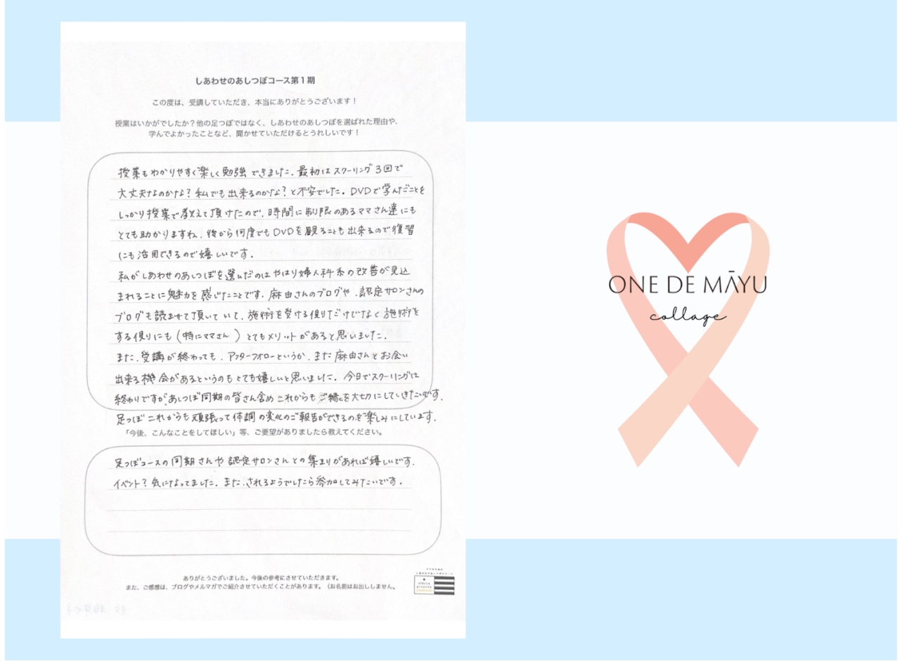 また、受講が終わっても、アフターフォローというか、また麻由さんとお会い出来る機会があるというのもとても嬉しいと思いました。