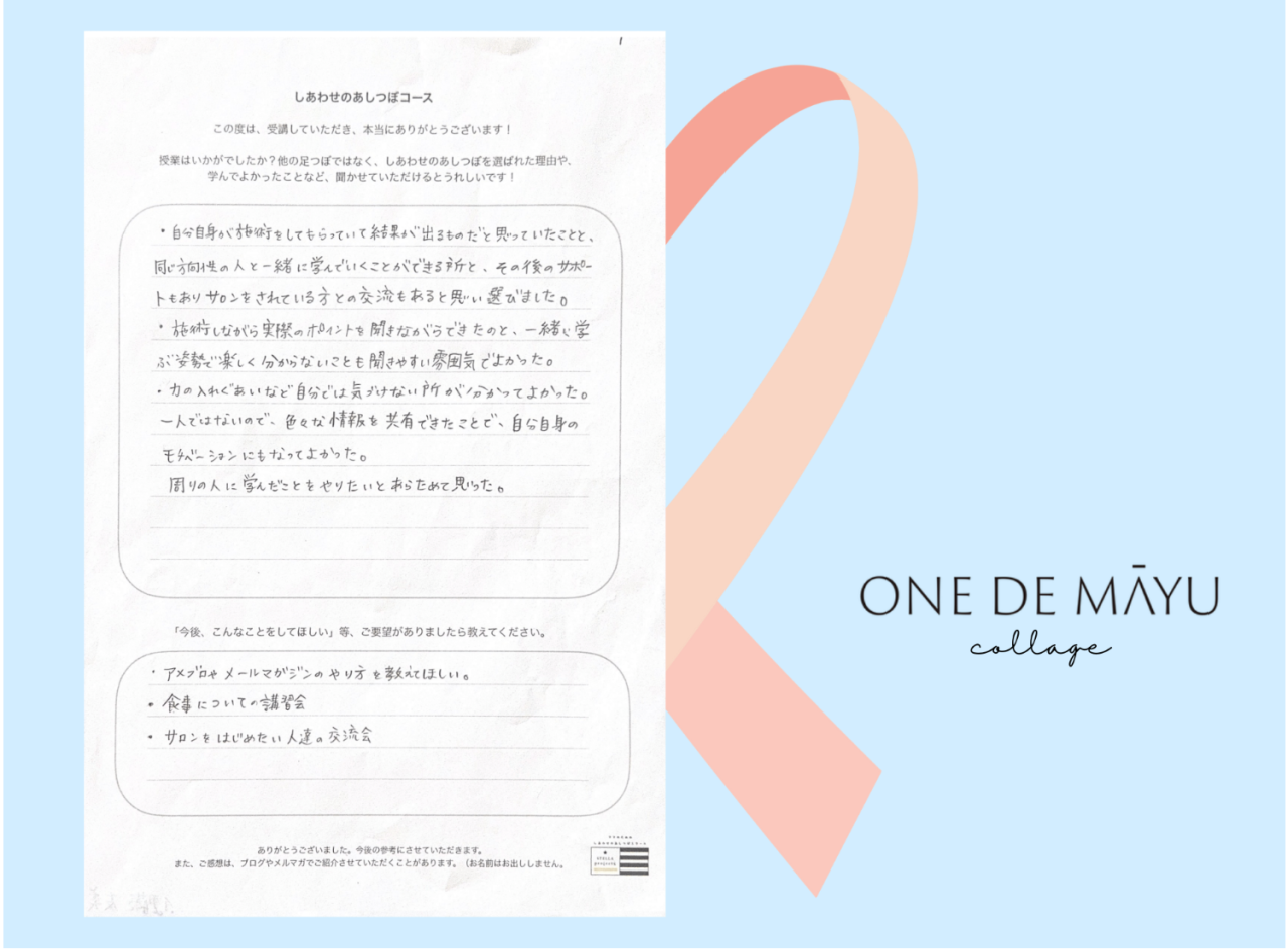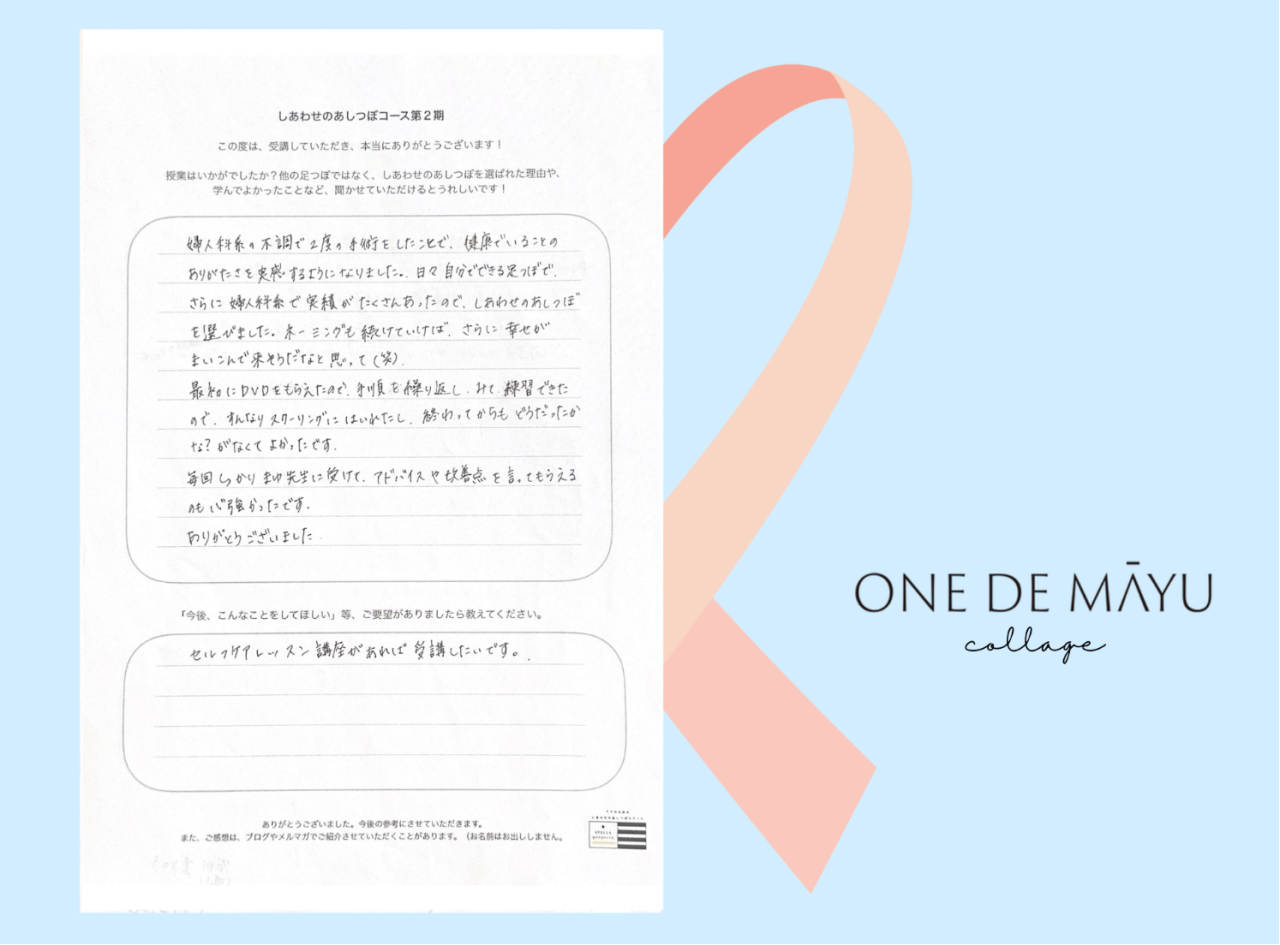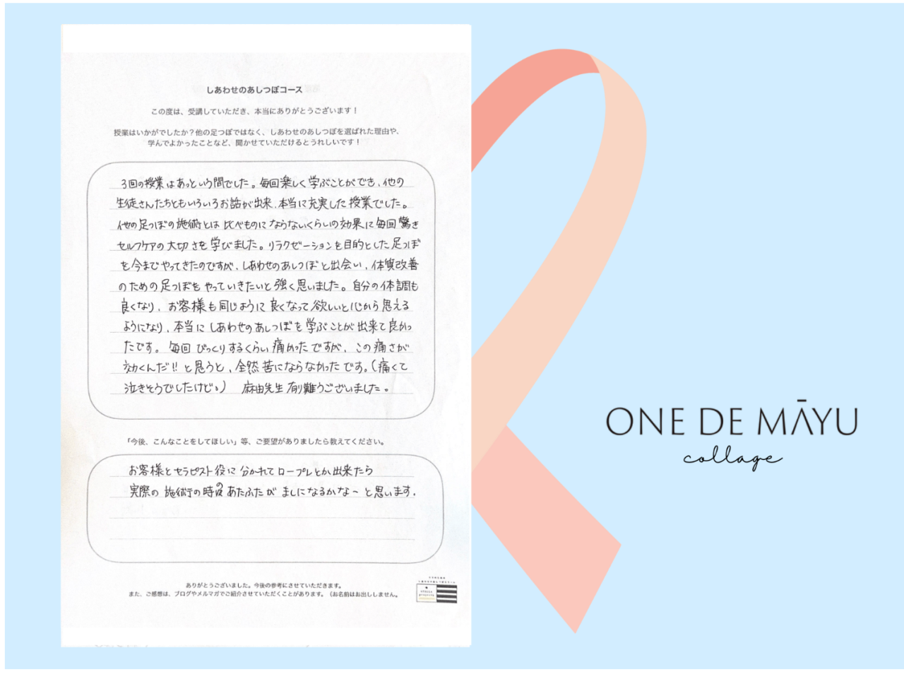 他の足つぼの施術とは比べものにならないくらいの効果に毎回驚き、セルフケアの大切さを学びました。