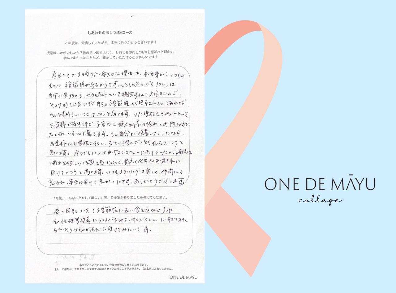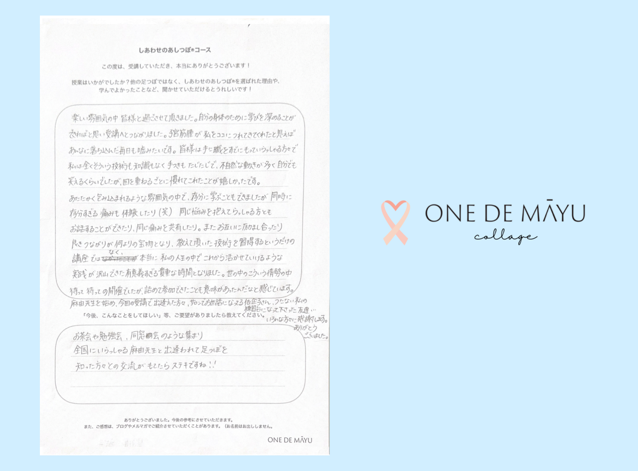 自分の病気からマユさんのブログを見つけてiTuboの事を知り、改善の為に学んでみたいと思い受講しました。