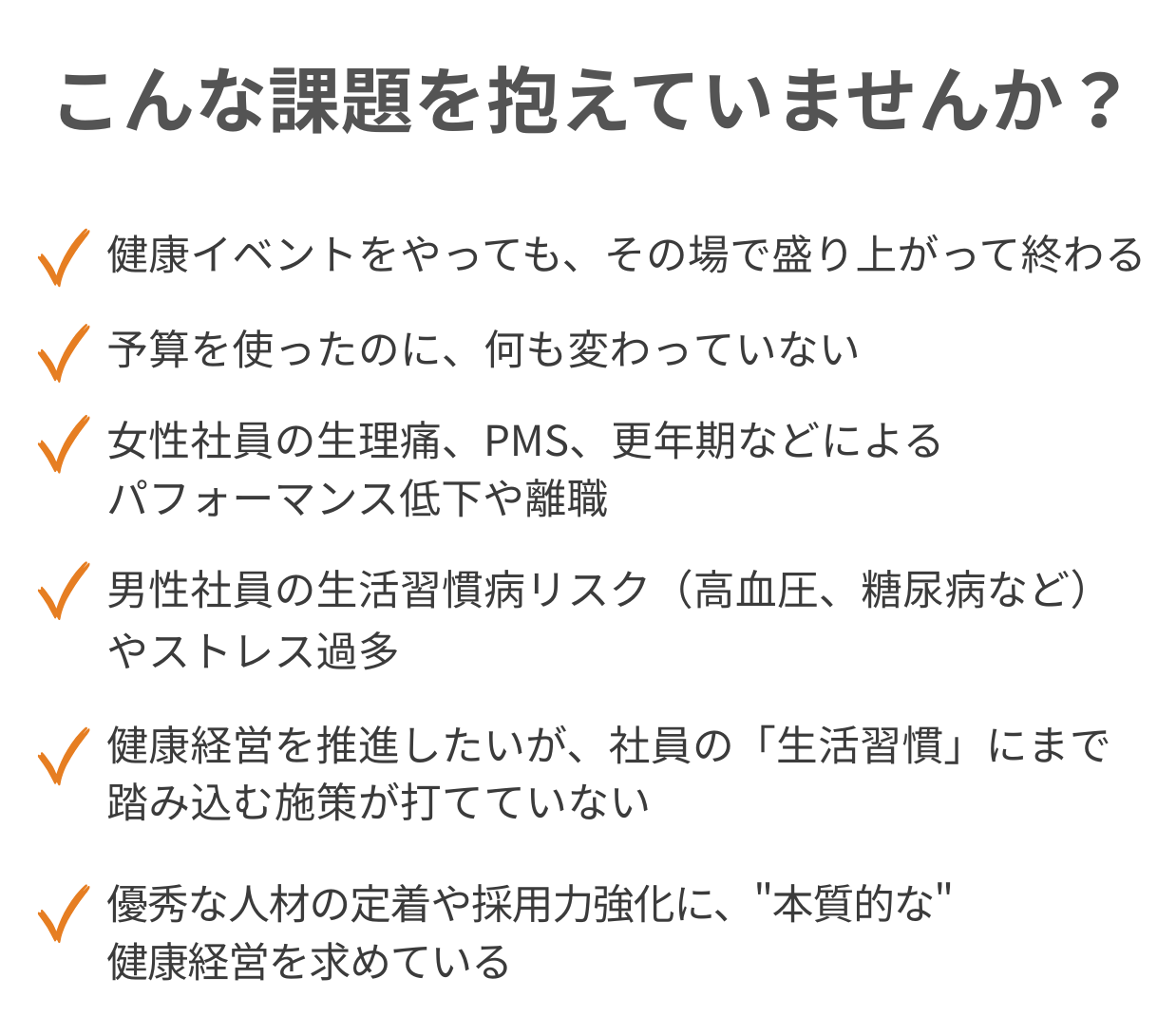 A. 業種は問いません。特に、女性社員が多い企業、デスクワーク中心の企業、健康経営に本気で取り組みたい企業におすすめです。