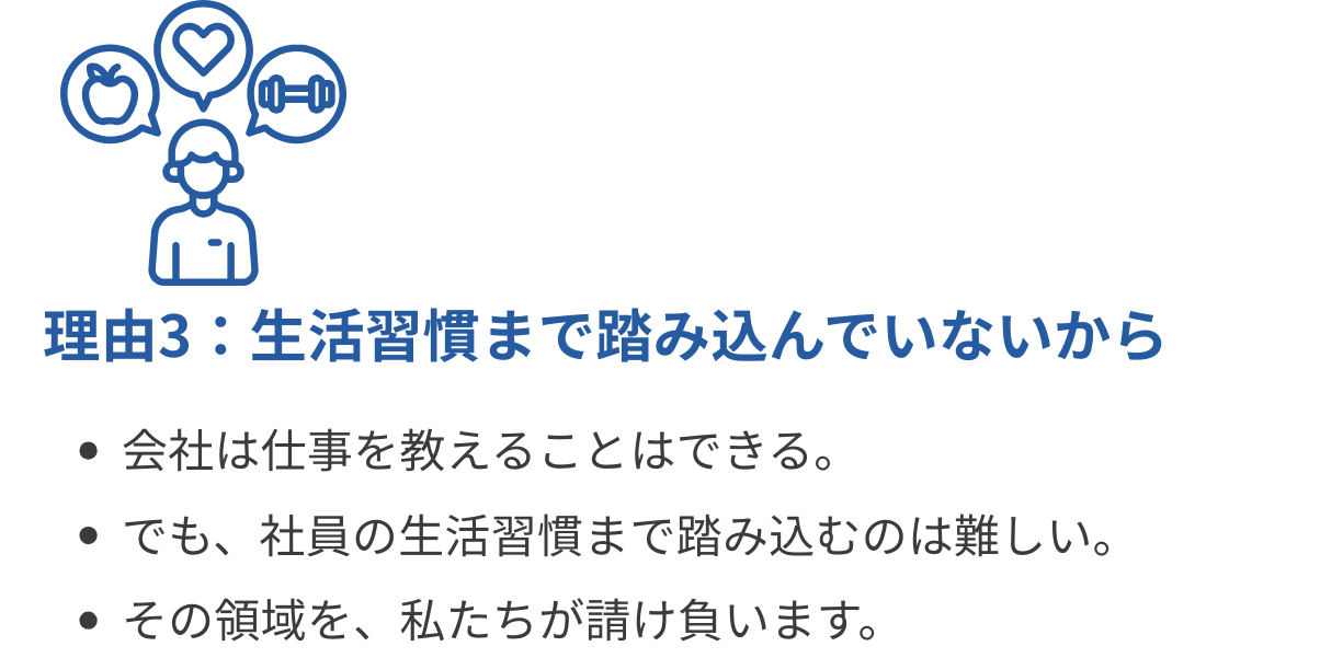 生活習慣は私たちが育てます。 企業は、仕事に集中してください。